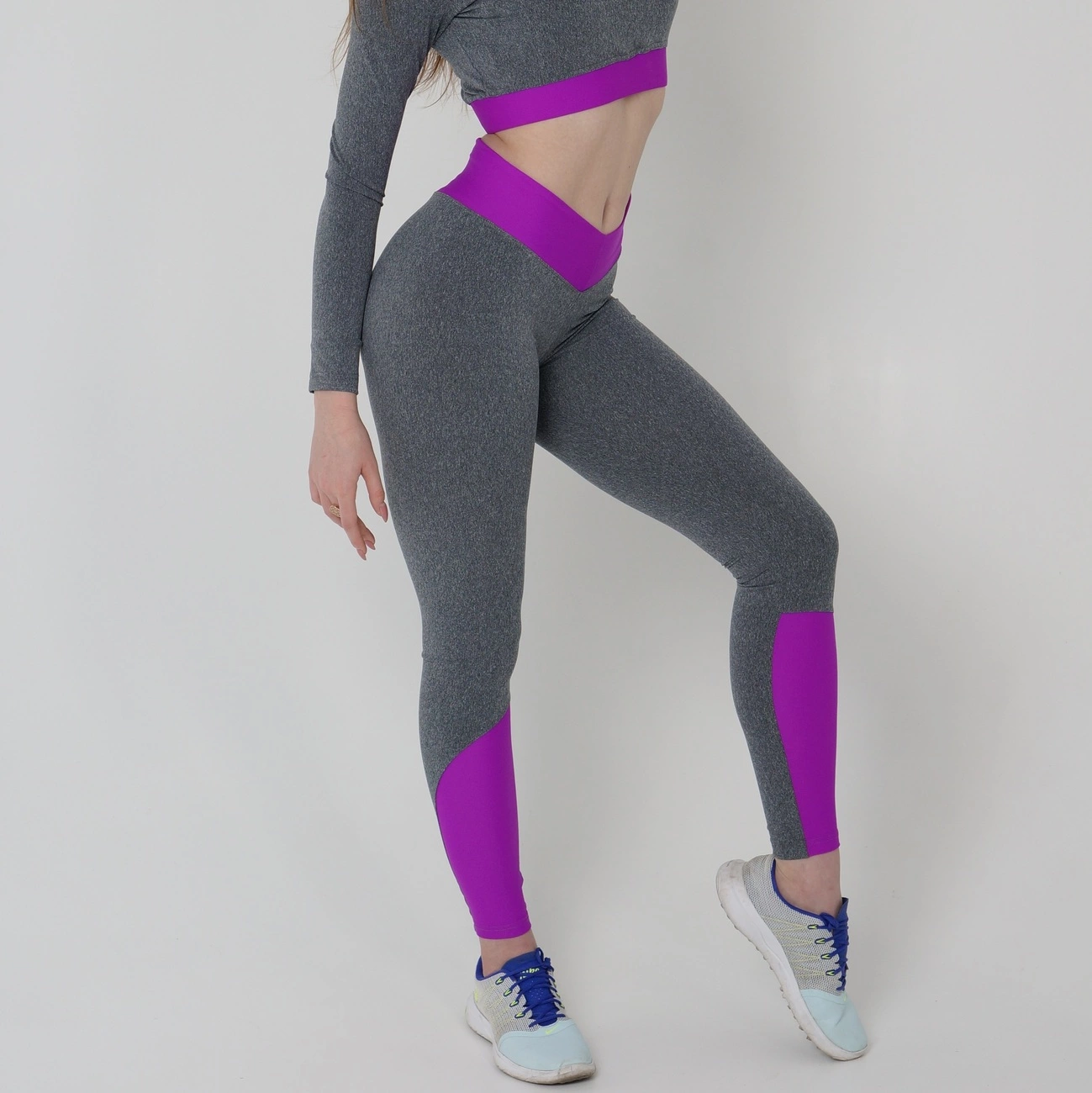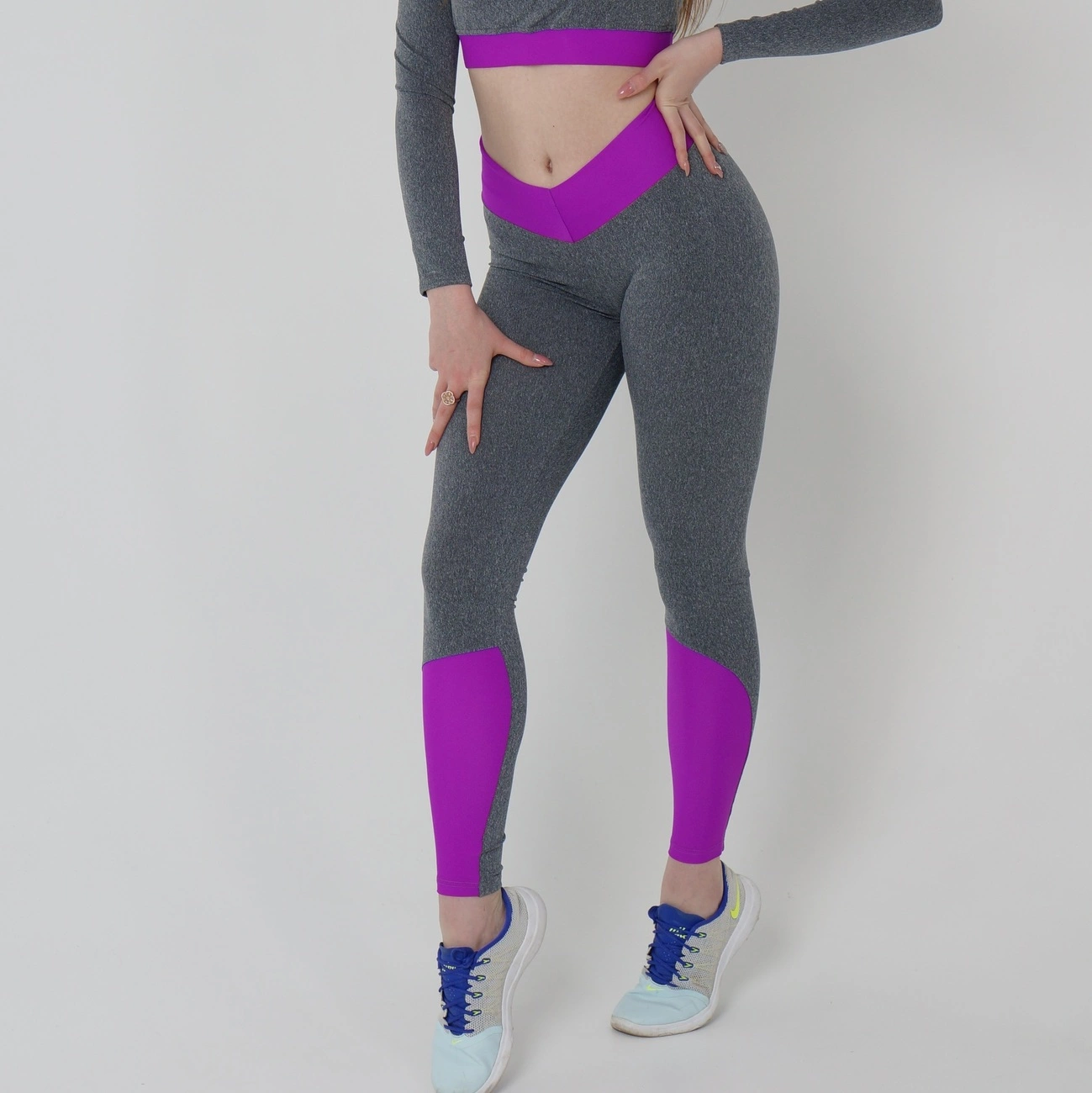 Эти леггинсы взорвут весь мир! Фиолетовый пояс и также нижние вставки, очень хорошо дополняют серый цвет. Изготовлены из бифлекса (80% нейлон, 20% спандекс). Скрывают недостатки, удобная высокая посадка, отличная утяжка, не сковывают движения. При занятии спортом, вы будете чувствовать себя комфортно и уверенно, так как они не просвечивают!