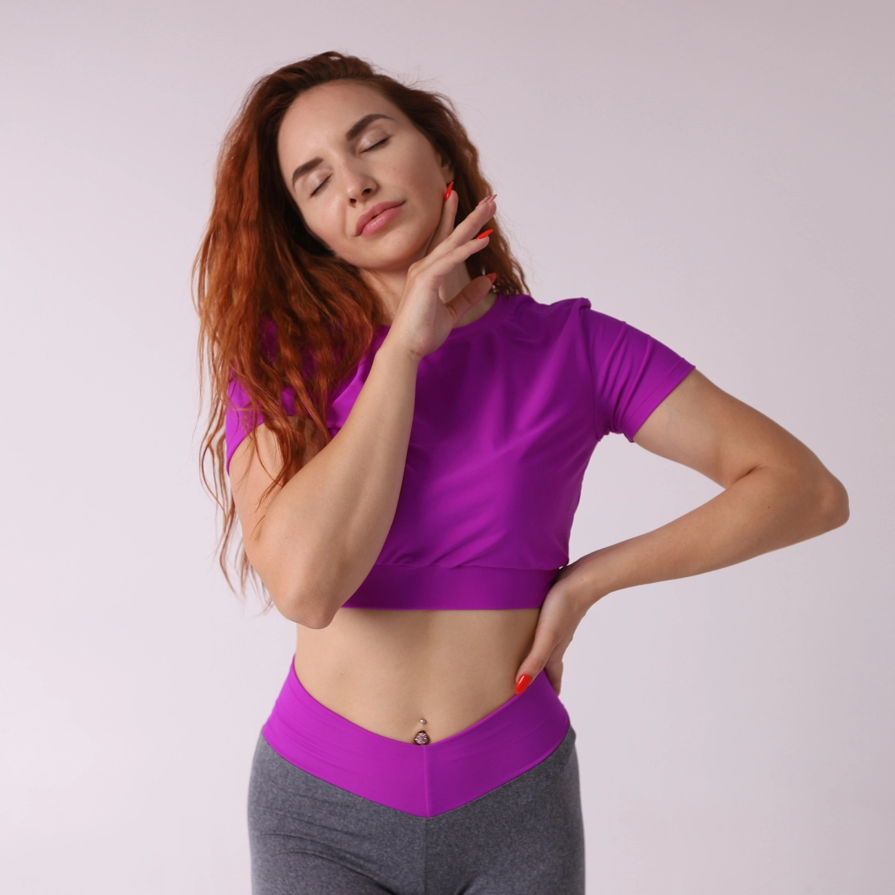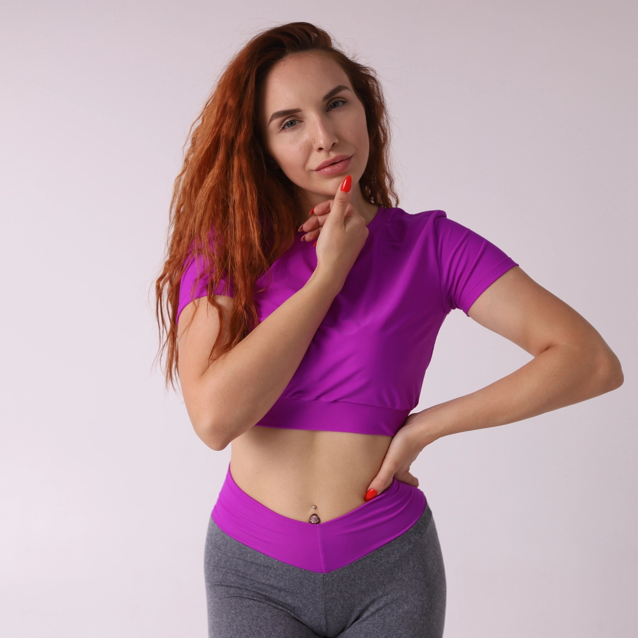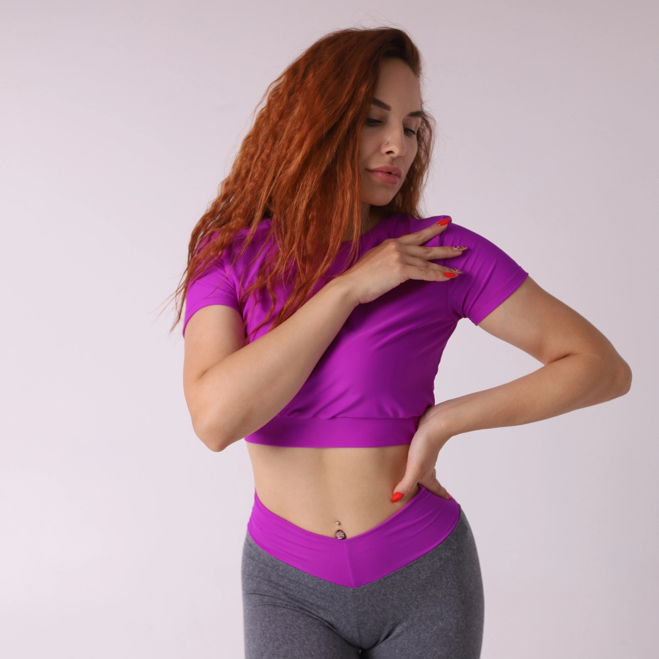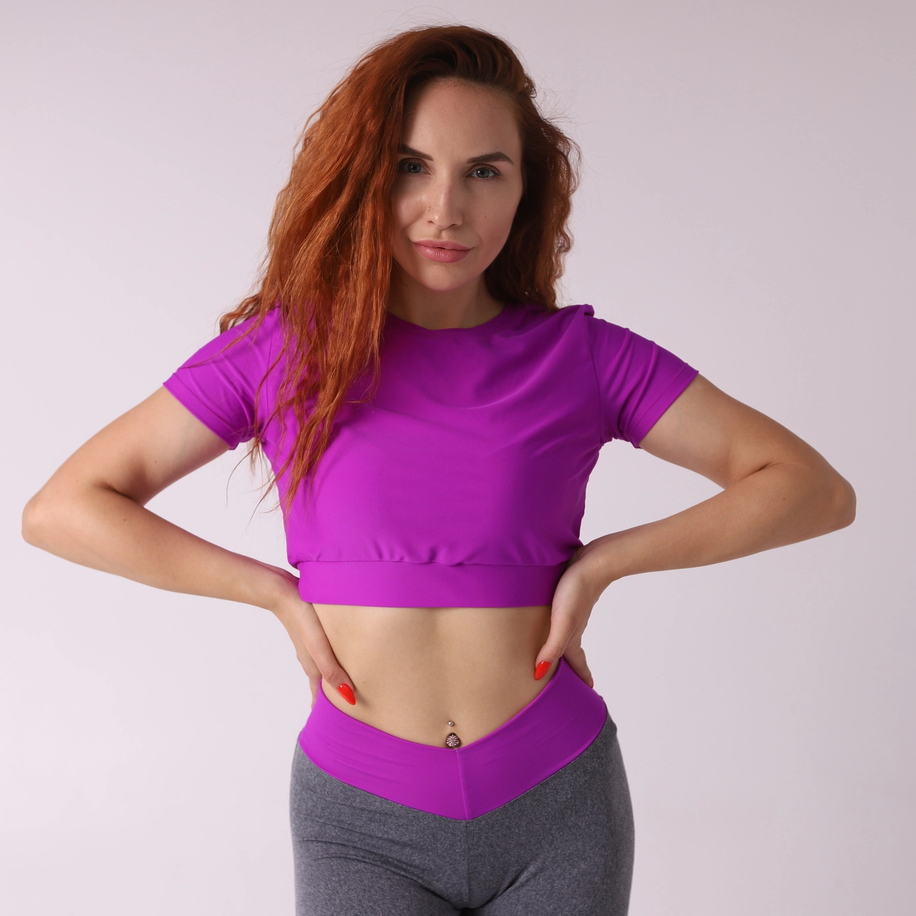 Яркий фиолетовый цвет очень хорошо сочитается с серыми лосинами и черными.