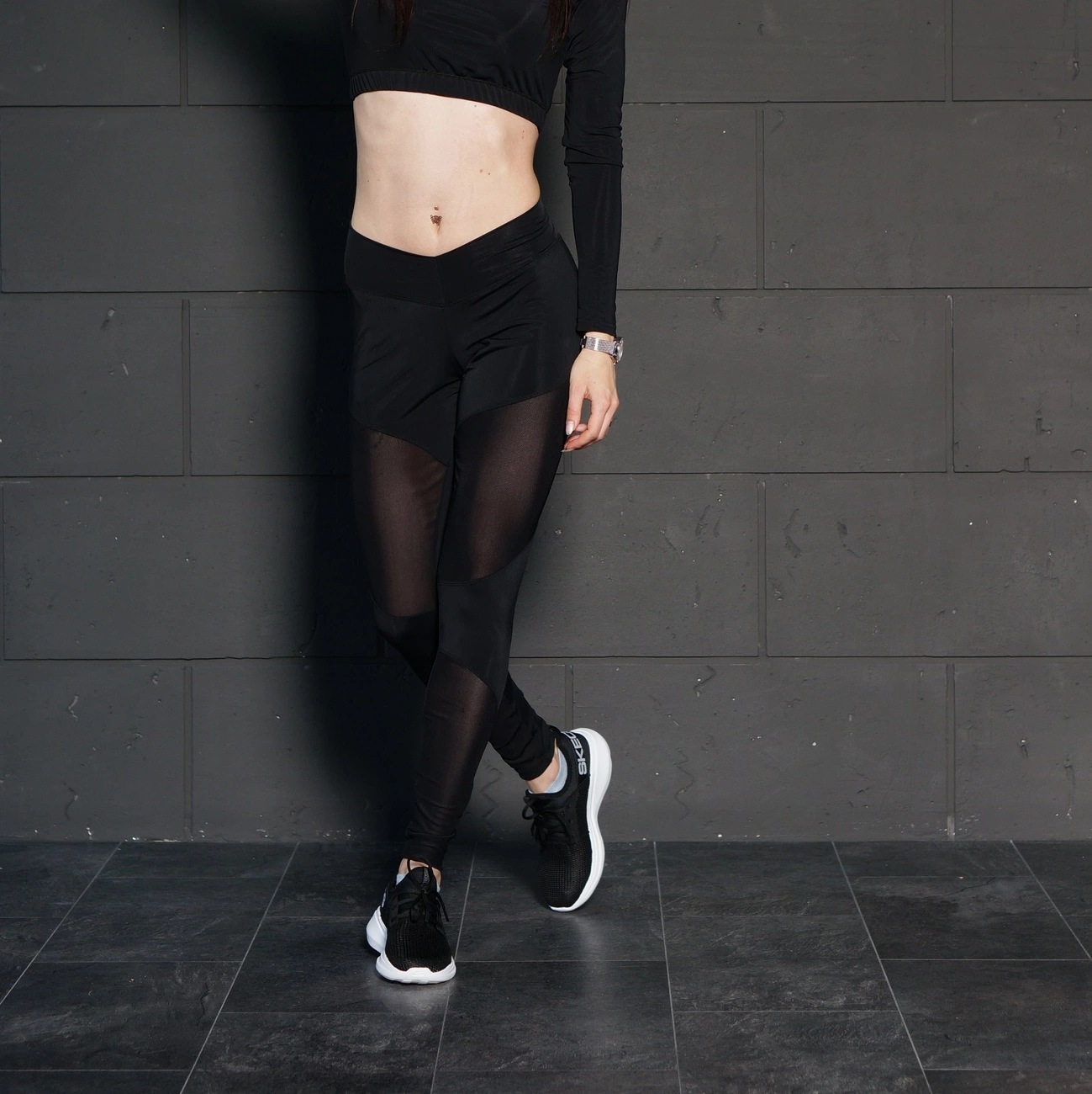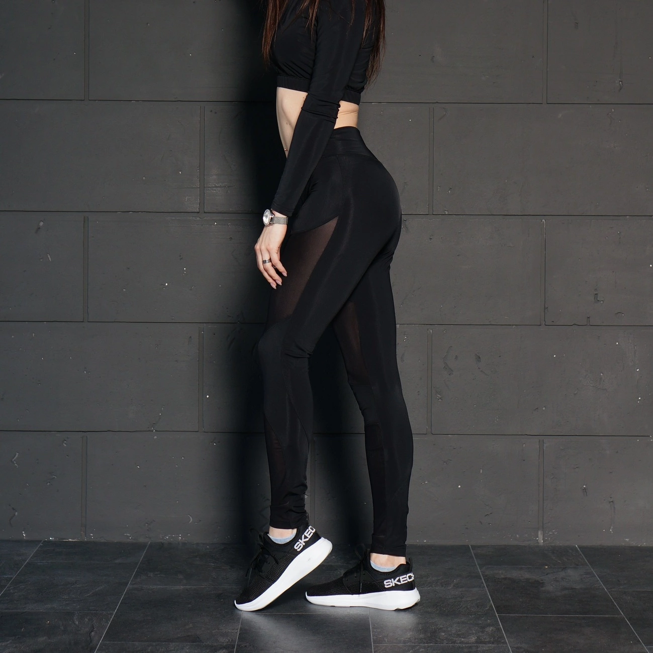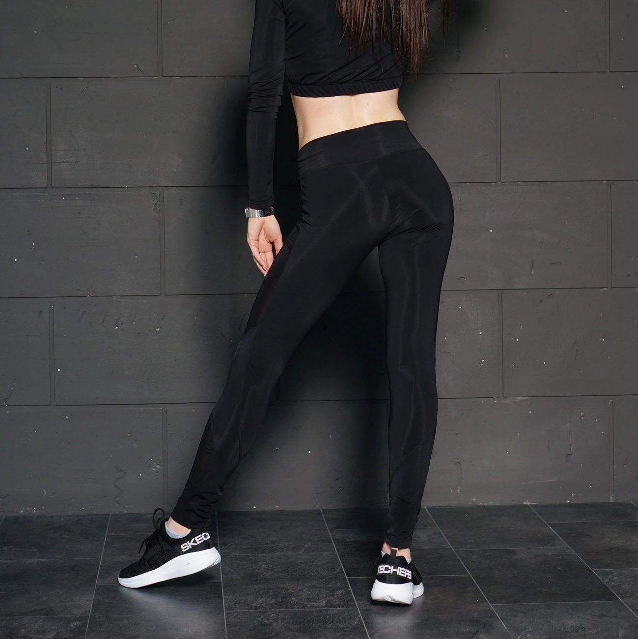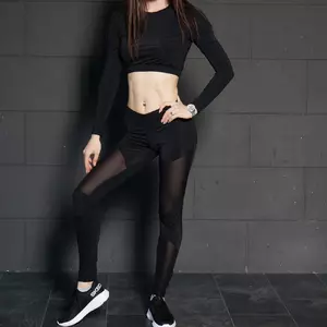 Черные спортивные леггинсы со вставками из сетки спереди. Интересный и практичный дизайн. Изготовлены из бифлекса (80% нейлон, 20% спандекс). Скрывают недостатки, удобная высокая посадка, отличная утяжка, не сковывают движения. При занятии спортом, вы будете чувствовать себя комфортно и уверенно, так как они не просвечиваются!